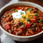 Homemade Chili is the ultimate comfort food—rich, hearty, and loaded with bold, savory flavor. This version combines tender ground beef and pork sausage with a blend of spices, tomatoes, and beans, simmered to perfection. It’s a recipe that strikes the perfect balance between heat, tang, and deep, slow-cooked flavor, thanks to ingredients like red wine vinegar, tomato juice, and a touch of brown sugar. Whether you’re feeding a hungry family, preparing for game day, or craving a cozy meal on a cold night, this chili is guaranteed to satisfy.